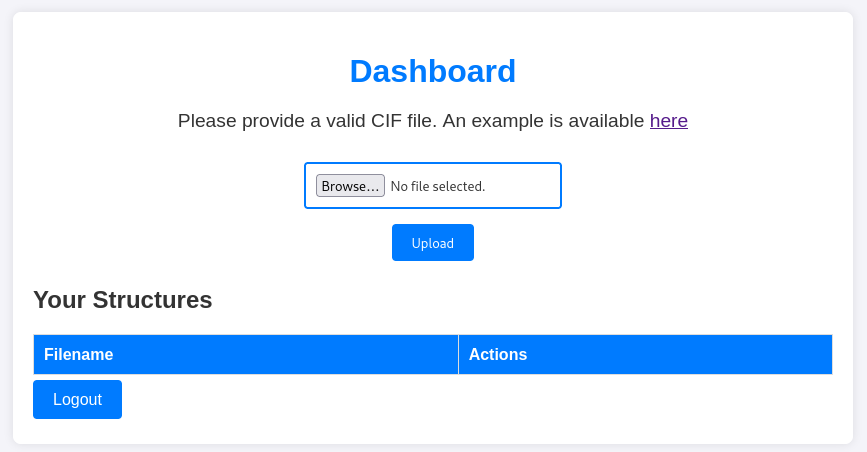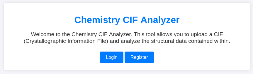 Explorando la aplicación web, vemos que nos permite registrarnos y subir nuestros propios archivos «.cif«, además, nos da un modelo de cómo ha de ser la estructura.