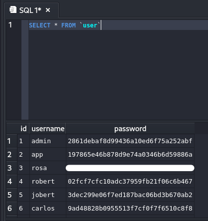 Ahora que ya tenemos acceso al sistema, comenzamos nuestra fase de enumeración interna, revisando los archivos de la aplicación web, localizamos la base de datos que almacena la información de los usuarios registrados, de los cuales, uno aparece en el directorio «/home«.