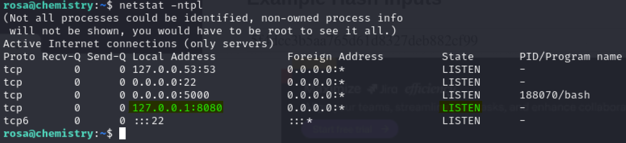 Para este paso, si miramos las conexiones activas, podemos percatarnos de una bastante llamativa «127.0.0.1:8080«, pero como la conexión solo es permitida desde la máquina local, lo que haremos será crear un túnel para poder acceder a este servicio desde nuestra propia máquina local aprovechando que tenemos unas credenciales legítimas, de lo contrario deberíamos realizar un túnel inverso.