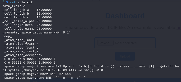 Para explotar esta vulnerabilidad, inyectamos un payload malicioso dentro de un archivo CIF legítimo. Al subir el archivo a la plataforma, el analizador lo procesa y ejecuta nuestro código, lo que nos permite entablar una reverse shell y obtener acceso a la máquina con los privilegios del usuario del servicio web.